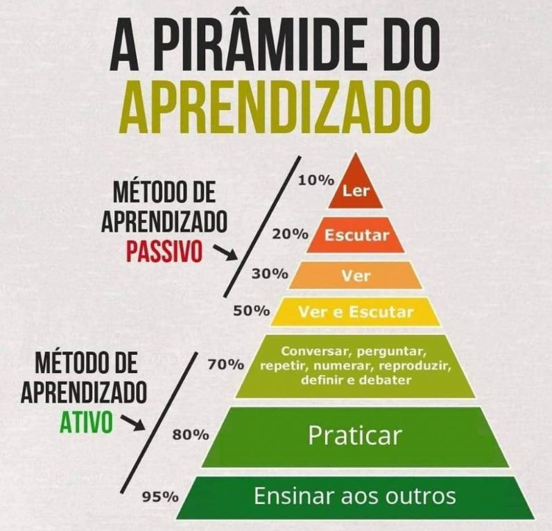 Ou seja, a pirâmide do Will ajuda a organizar as atividades de um programa educacional ou de um plano de estudos, por exemplo, pois dá verbos/ações sobre o que seria interessante fazer e o quanto de captação de aprendizagem isso traz.